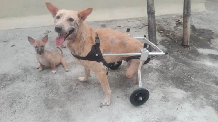Dede (Destiny) had both back legs amputated. She was paralysed in a road accident and her legs were getting very sore. We tried her with a wheelchair but she reacted very badly to it but seems to be getting on fine now her legs are not in her way.